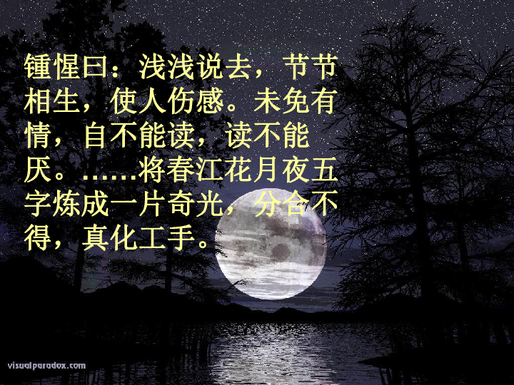 “江畔何人初见月?江月何年初照人?人生代代无穷已,江月年年望相似。”